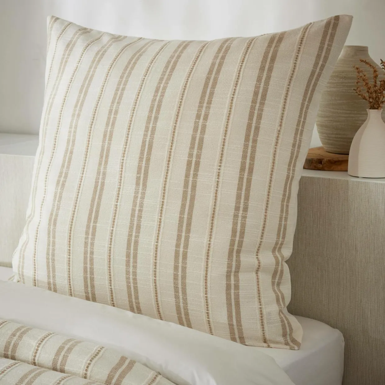 Cette taie possède une face en coton texturé, avec des rayures en relief, et une face en percale de coton.