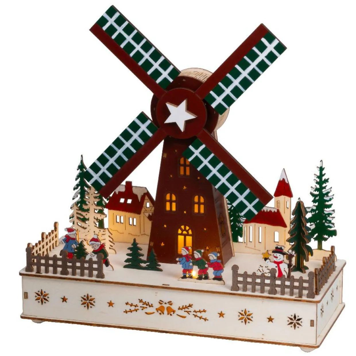 Ce charmant village de Noël en bois, avec son moulin à vent animé, apportera une touche chaleureuse et festive à votre intérieur. Éclairé par des LED de couleur blanc chaud, ce village de Noël musical est alimenté par piles, vous permettant de le placer où vous le souhaitez sans avoir à vous soucier des prises électriques.