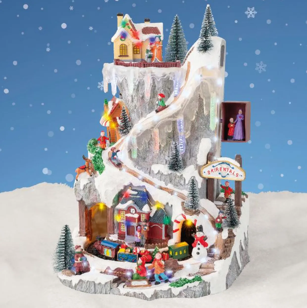 Ajoutez cette pièce spectaculaire à votre décoration pour une touche de magie et d’animation inégalée. Dotée de glaçons à effet neige tombante de toutes les couleurs, avec son ascenseur et train en mouvement, cette scène dynamique est parfaite pour captiver l’attention.
