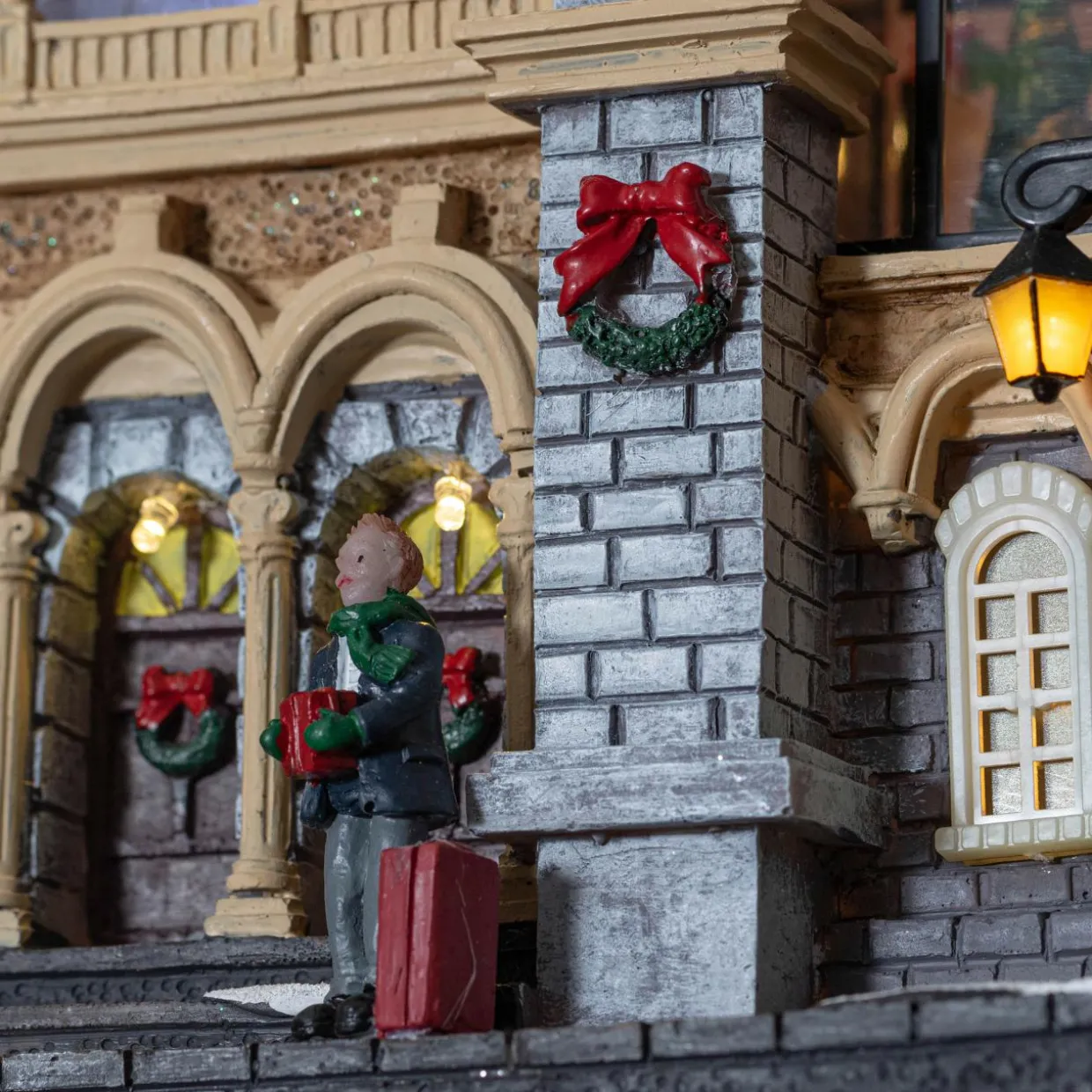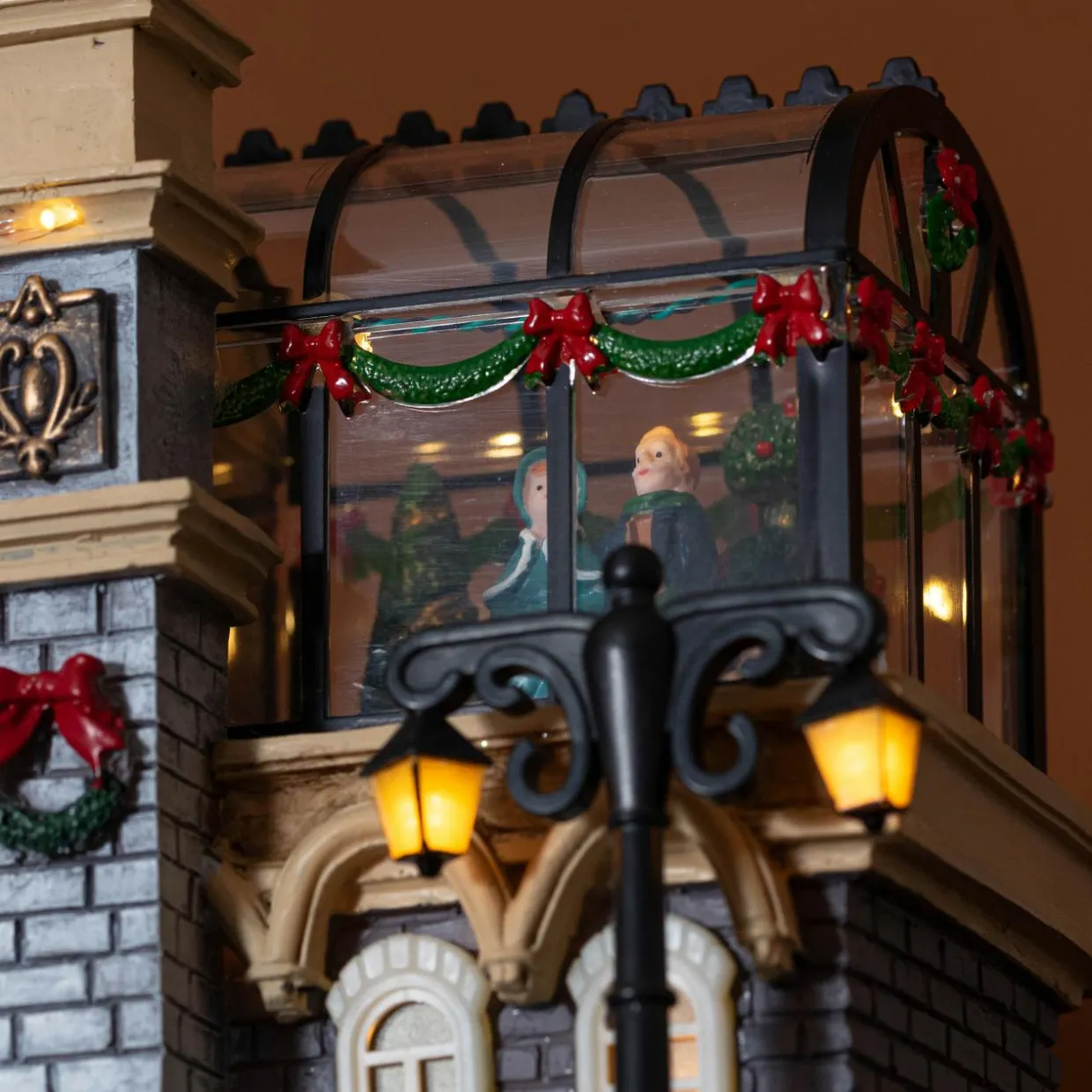 Mode de fonctionnement : à brancher sur une prise électrique (transfo IP20 fourni). Le village est musical et lumineux. Possède 25 micro LED fonction lumière fixe. Consomme 0.00360 Kwh par heure d’utilisation.