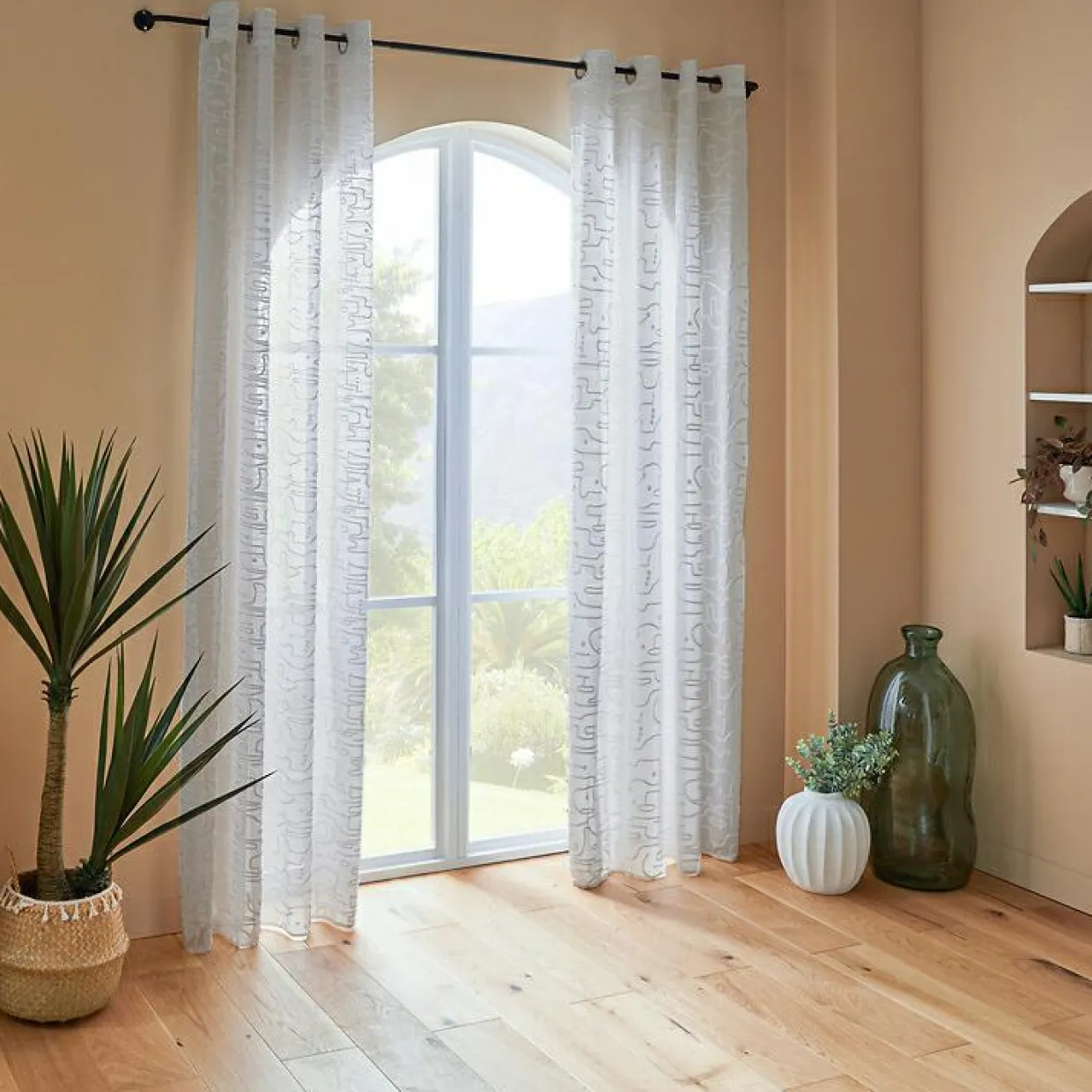 Ce voilage vaporeux, à motif géométrique, habillera avec délicatesse votre fenêtre.