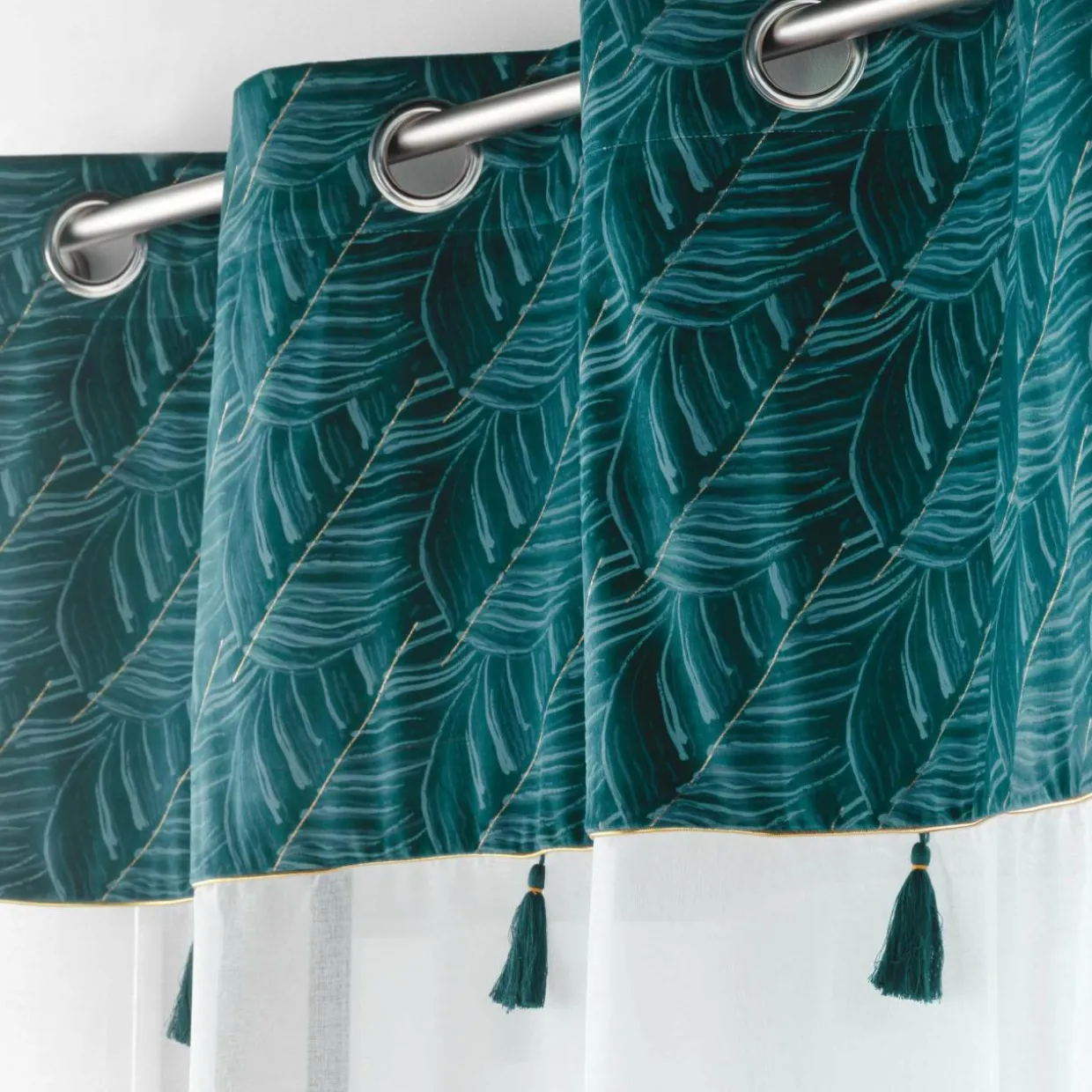 Imprimé : haut du voilage à motif feuillage exotique et à pompons.
