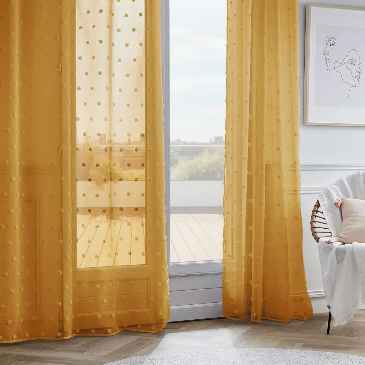 Ce voilage, à pompons délicats, possède une texture légère et un aspect vaporeux.