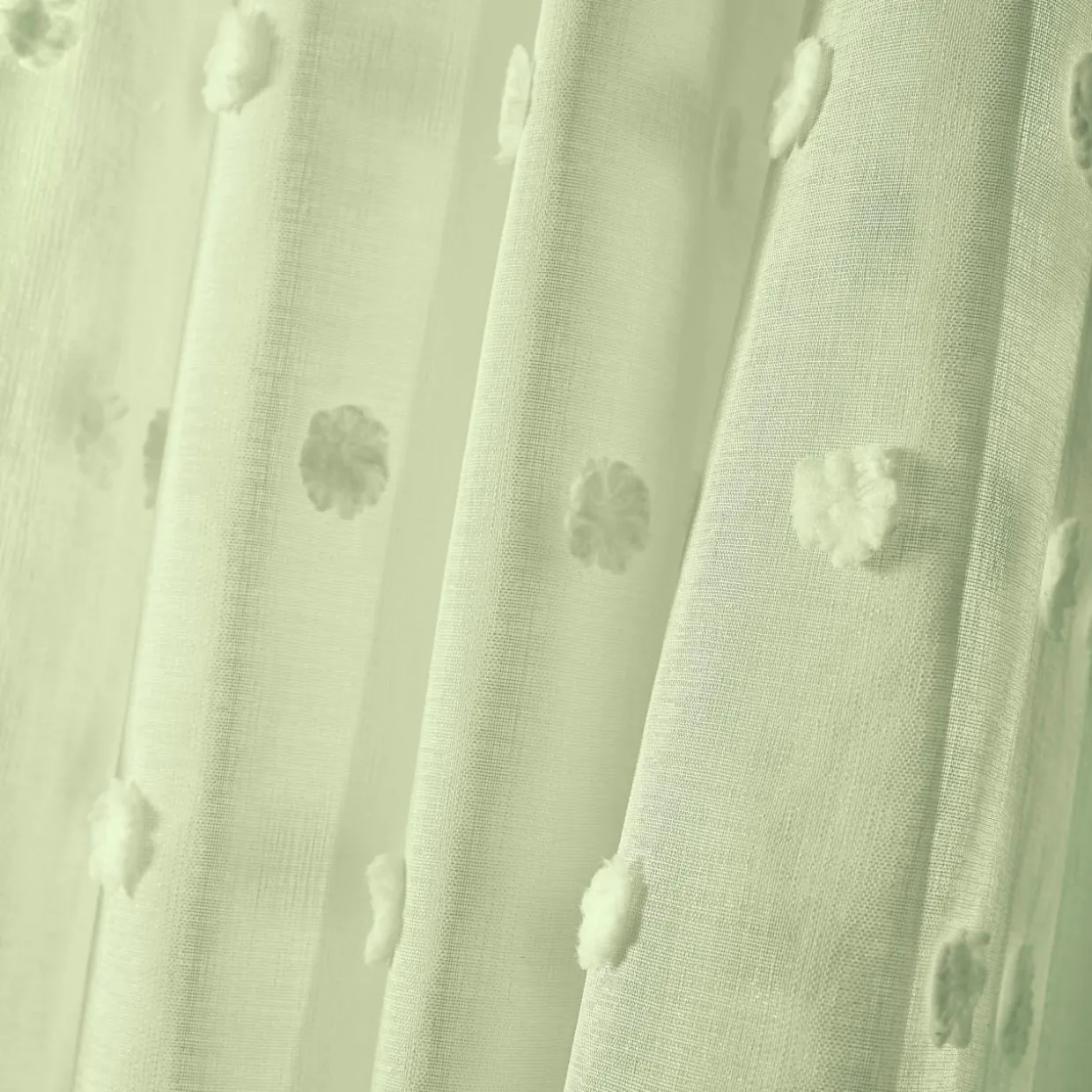 Ce voilage, à pompons délicats, possède une texture légère et un aspect vaporeux.